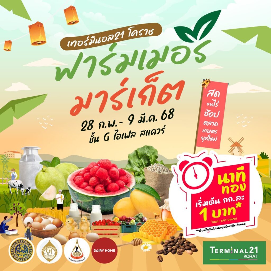 การท่องเที่ยวแห่งประเทศไทย สำนักงานนครราชสีมา ขอเชิญเที่ยวงาน ฟาร์มเมอร์ มาร์เก็ตวันที่ 28 กุมภาพันธ์ – 9 มีนาคม 2568 ณ ชั้น G – ไอเฟล สแควร์ Terminal21 จังหวัดนครราชสีมาภายในงาน พบสินค้าเกษตรอินทรีย์สดๆ จากไร่ชั้นนำทั่วประเทศ ผักออร์แกนิค, ผลไม้ตามฤดูกาล, ผลิตภัณฑ์นม, และอาหารอร่อยเพื่อสุขภาพ พิเศษกับ สินค้าเกษตรนาทีทอง เริ่มต้น กก. ละ 1 บาท (ทุกวันเสาร์-อาทิตย์)