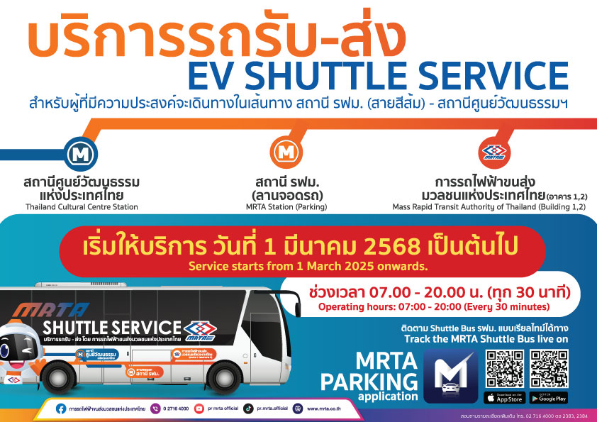 การรถไฟฟ้าขนส่งมวลชนแห่งประเทศไทย อำนวยความสะดวกด้วยบริการรถรับ – ส่ง EV Shuttle Service สำหรับผู้ที่มีความประสงค์จะเดินทางในเส้นทาง สถานี รฟม. (สายสีส้ม) – สถานีศูนย์วัฒนธรรมฯ และผู้มาติดต่อสำนักงาน การรถไฟฟ้าขนส่งมวลชนแห่งประเทศไทย (ถ.พระราม 9) เริ่มวันที่ 1 มีนาคม 2568 เป็นต้นไป