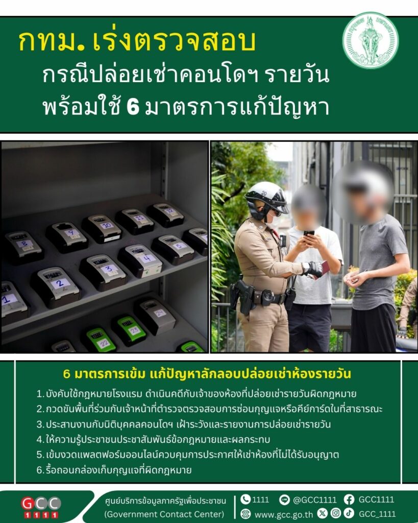 - กรุงเทพมหานคร ได้เร่งตรวจสอบกรณีที่มีการปล่อยเช่าคอนโดฯ รายวัน โดยเฉพาะในพื้นที่ใจกลางเมือง เช่น สุขุมวิทและสาทร