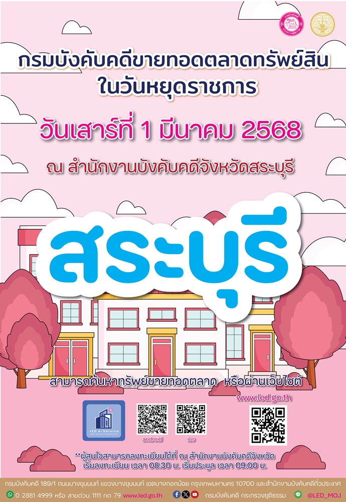 กรมบังคับคดี จัดขายทอดตลาดทรัพย์สินในวันหยุดราชการ ในวันเสาร์ที่ 1 มีนาคม 2568 ณ สำนักงานบังคับคดีจังหวัดสระบุรี เริ่มลงทะเบียน เวลา 8.30 น. เริ่มประมูล เวลา 09.00 น.