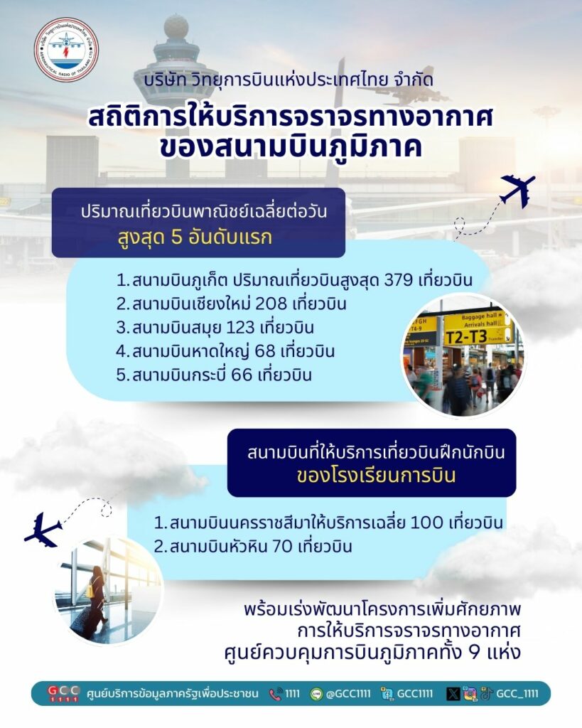 บริษัท วิทยุการบินแห่งประเทศไทย จำกัด รายงานสถิติการให้บริการจราจรทางอากาศของสนามบินภูมิภาค พร้อมเดินหน้าโครงการเพิ่มศักยภาพการให้บริการจราจรทางอากาศ 9 ศูนย์ควบคุมการบินภูมิภาค