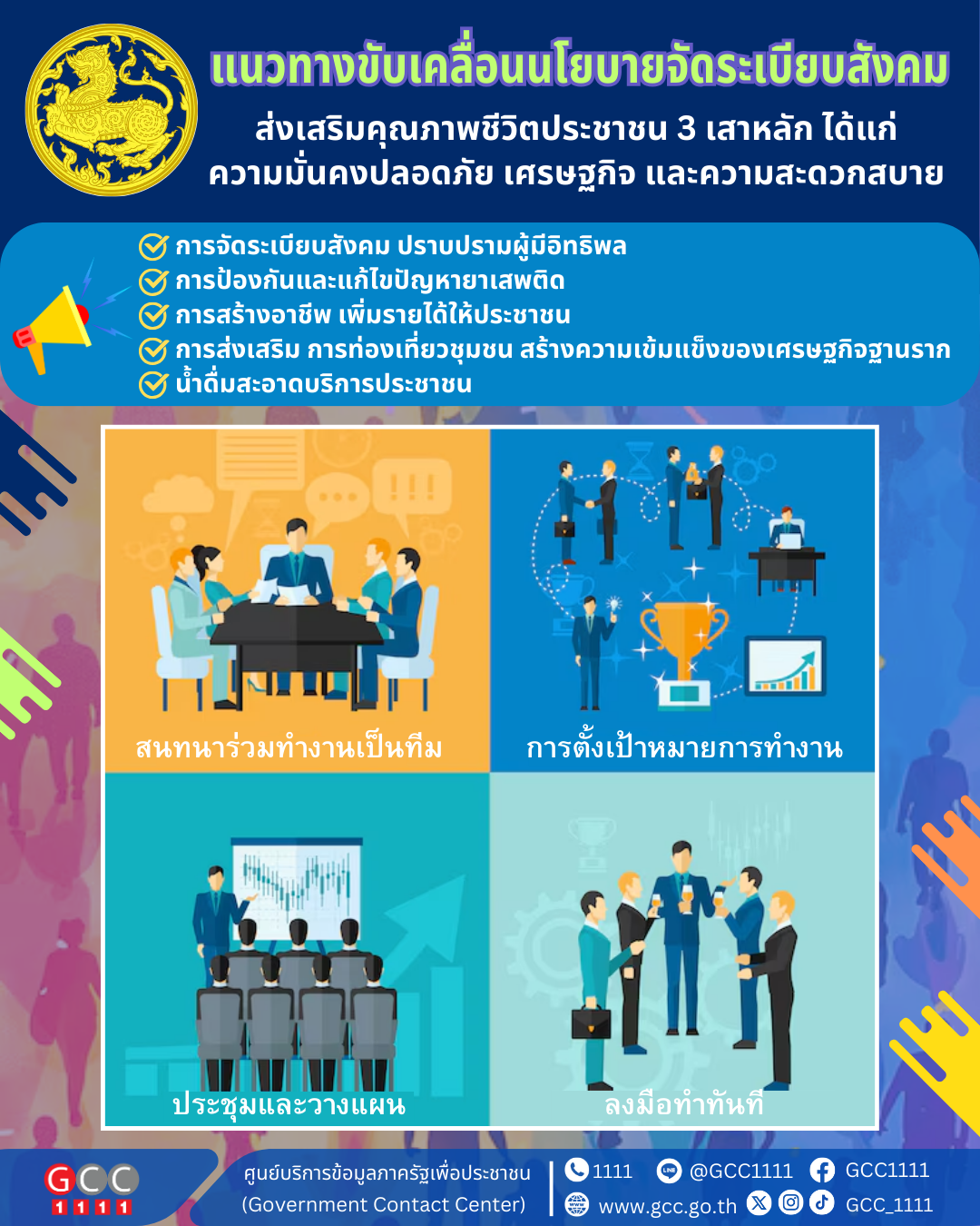 เพื่อให้การขับเคลื่อนการดําเนินงานตามนโยบายจัดระเบียบสังคมเกิดผลอย่างเป็นรูปธรรม และเป็นไปในทิศทางเดียวกัน บรรลุเป้าหมายของการสร้างความมั่นคงปลอดภัย และเกิดประโยชน์สูงสุด ต่อประชาชน กระทรวงมหาดไทยจึงแจ้งแนวทางขับเคลื่อนนโยบายจัดระเบียบสังคม ดังนี้