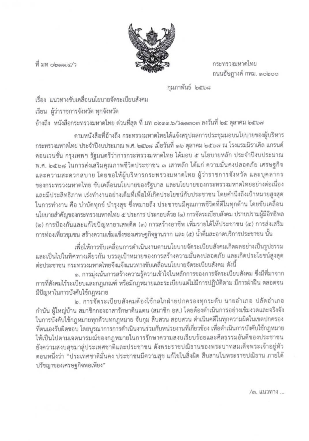 เรื่อง แนวทางขับเคลื่อนนโยบายจัดระเบียบสังคม เรียน ผู้ว่าราชการจังหวัด ทุกจังหวัด อ้างถึง หนังสือกระทรวงมหาดไทย ด่วนที่สุด ที่ มท 0211.2/ว11303 ลงวันที่ 25 ตุลาคม 2567