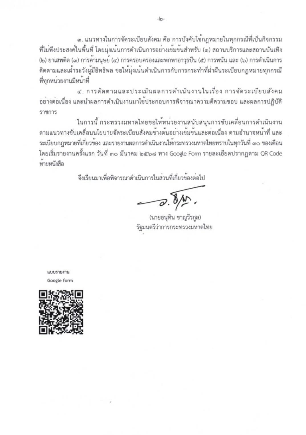 • การติดตามและประเมินผลการดําเนินงานในเรื่อง การจัดระเบียบสังคม อย่างต่อเนื่อง และนําผลการดําเนินงานมาใช้ประกอบการพิจารณาความดีความชอบ และผลการปฏิบัติราชการในการนี้ กระทรวงมหาดไทยขอให้หน่วยงานสนับสนุนการขับเคลื่อนการดําเนินงาน ตามแนวทางขับเคลื่อนนโยบายจัดระเบียบสังคมข้างต้นอย่างเข้มข้นและต่อเนื่อง ตามอํานาจหน้าที่ และ ระเบียบกฎหมายที่เกี่ยวข้อง และรายงานผลการดําเนินงานให้กระทรวงมหาดไทยทราบในทุกวันที่ 30 ของเดือน โดยเริ่มรายงานครั้งแรก วันที่ 30 มีนาคม 2568 ทาง Google Form รายละเอียดปรากฏตาม QR Code ท้ายหนังสือ