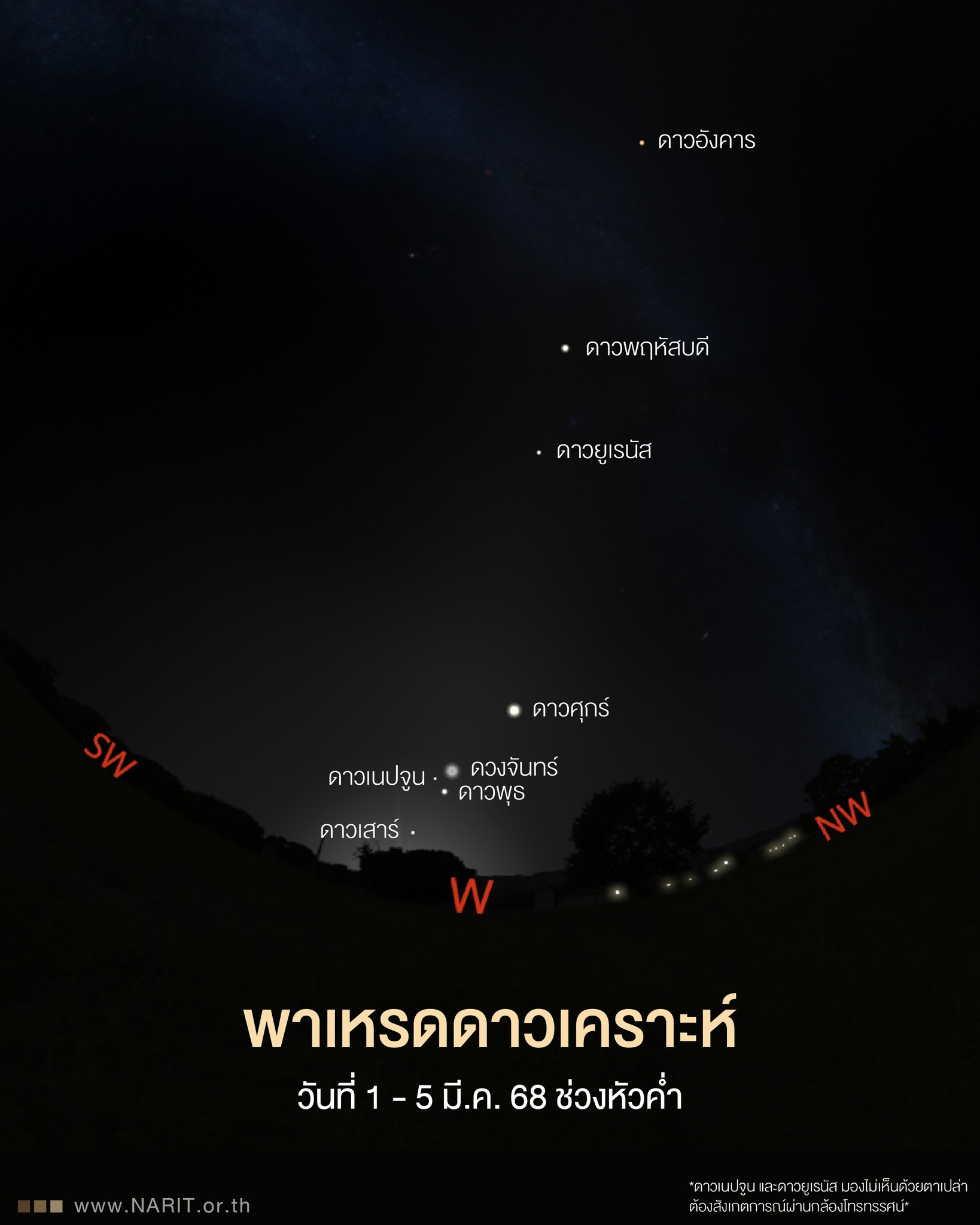 สถาบันวิจัยดาราศาสตร์แห่งชาติ เชิญชวนรับชม พาเหรดดาวเคราะห์ ช่วงหัวค่ำวันที่ 1 – 5 มีนาคม 2568 ได้แก่ ดาวเสาร์ ดาวพุธ ดาวศุกร์ ดาวพฤหัสบดี และดาวอังคาร โดยสังเกตได้ด้วยตาเปล่า รวมถึง ดาวเนปจูน ดาวยูเรนัส สังเกตเห็นได้หากมองผ่านกล้องโทรทรรศน์