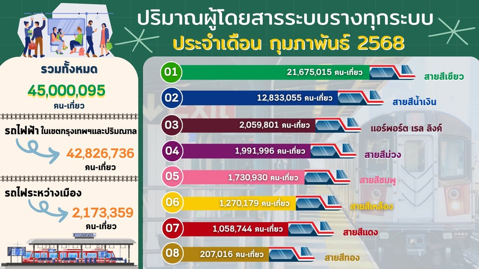 กรมการขนส่งทางราง เปิดเผยปริมาณผู้ใช้บริการระบบขนส่งทางราง ประจำเดือนกุมภาพันธ์ 2568 ข่าวสารกิจกรรม กรมการขนส่งทางราง เปิดเผยปริมาณผู้ใช้บริการระบบขนส่งทางราง ประจำเดือนกุมภาพันธ์ 2568 กรมการขนส่งทางราง เปิดเผยปริมาณผู้ใช้บริการระบบขนส่งทางราง ประจำเดือนกุมภาพันธ์ 2568 ผู้ใช้บริการทั้งหมด 45,000,095 คน-เที่ยว ประกอบด้วยรถไฟฟ้าในเขตกรุงเทพและปริมณฑล 42,826,736 คน-เที่ยวรถไฟระหว่างเมือง 2,173,359 คน-เที่ยวหมายเหตุ : คน-เที่ยว หมายถึง หน่วยการนับจำนวนผู้โดยสารที่มาใช้บริการ คือ ผู้โดยสารแตะเข้าสู่ระบบจนออกจากระบบ นับเป็น 1 คน-เที่ยว ที่มา : https://citly.me/EYa7d Post Views: 6 FacebookFacebookXTwitterLINELine
