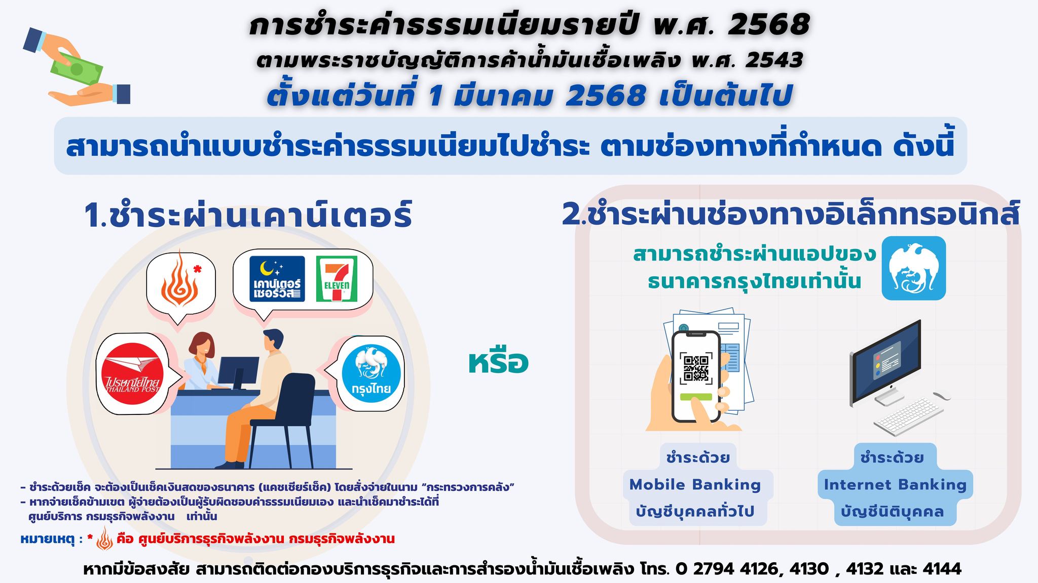 กรมธุรกิจพลังงาน แจ้งช่องทางการชำระค่าธรรมเนียมรายปี 2568 ตามพระราชบัญญัติการค้าน้ำมันเชื้อเพลิง พ.ศ. 2543 ตั้งแต่วันที่ 1 มีนาคม 2568 เป็นต้นไป สามารถนำแบบชำระค่าธรรมเนียมไปชำระ ตามช่องทางที่กำหนด ดังนี้ ชำระผ่านเคาน์เตอร์ (ศูนย์บริการธุรกิจพลังงาน กรมธุรกิจพลังงาน / เคาน์เตอร์เซอร์วิส / ไปรษณีย์ไทย / ธนาคารกรุงไทย) ชำระผ่านช่องทางอิเล็กทรอนิกส์ผ่านแอปของธนาคารกรุงไทยเท่านั้น (Mobile Banking บัญชีบุคคลทั่วไป / Internet Banking บัญชีนิติบุคคล)