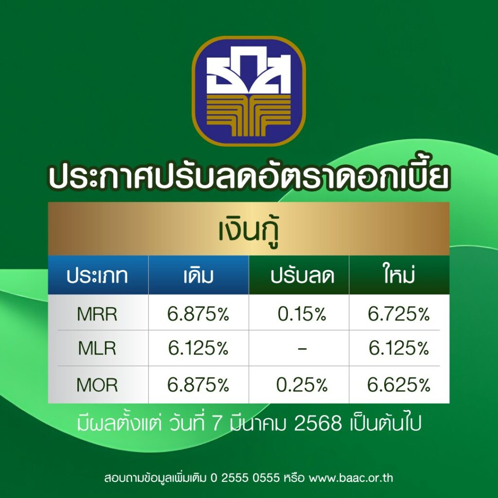 ธ.ก.ส. ประกาศลดอัตราดอกเบี้ยเงินกู้ สูงสุดร้อยละ 0.25 มีผลตั้งแต่วันที่ 7 มีนาคม 2568