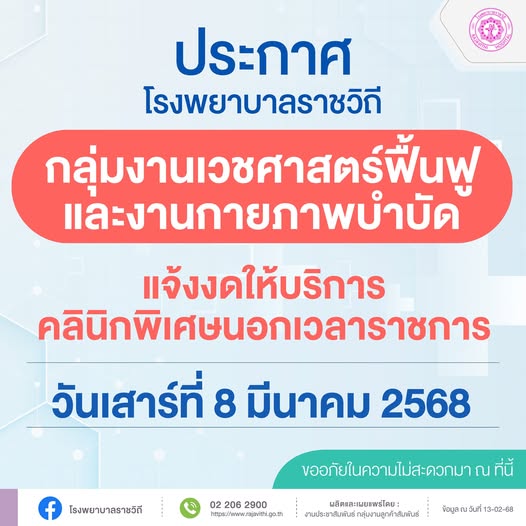 โรงพยาบาลราชวิถี แจ้ง “กลุ่มงานเวชศาสตร์ฟื้นฟู และงานกายภาพบำบัด” งดให้บริการคลินิกพิเศษนอกเวลาราชการ ข่าวสารกิจกรรม โรงพยาบาลราชวิถี แจ้ง “กลุ่มงานเวชศาสตร์ฟื้นฟู และงานกายภาพบำบัด” งดให้บริการคลินิกพิเศษนอกเวลาราชการ โรงพยาบาลราชวิถี แจ้ง “กลุ่มงานเวชศาสตร์ฟื้นฟู และงานกายภาพบำบัด” งดให้บริการคลินิกพิเศษนอกเวลาราชการ ในวันเสาร์ที่ 8 มีนาคม 2568 ที่มา : https://citly.me/cJeX3 Post Views: 24 FacebookFacebookXTwitterLINELine