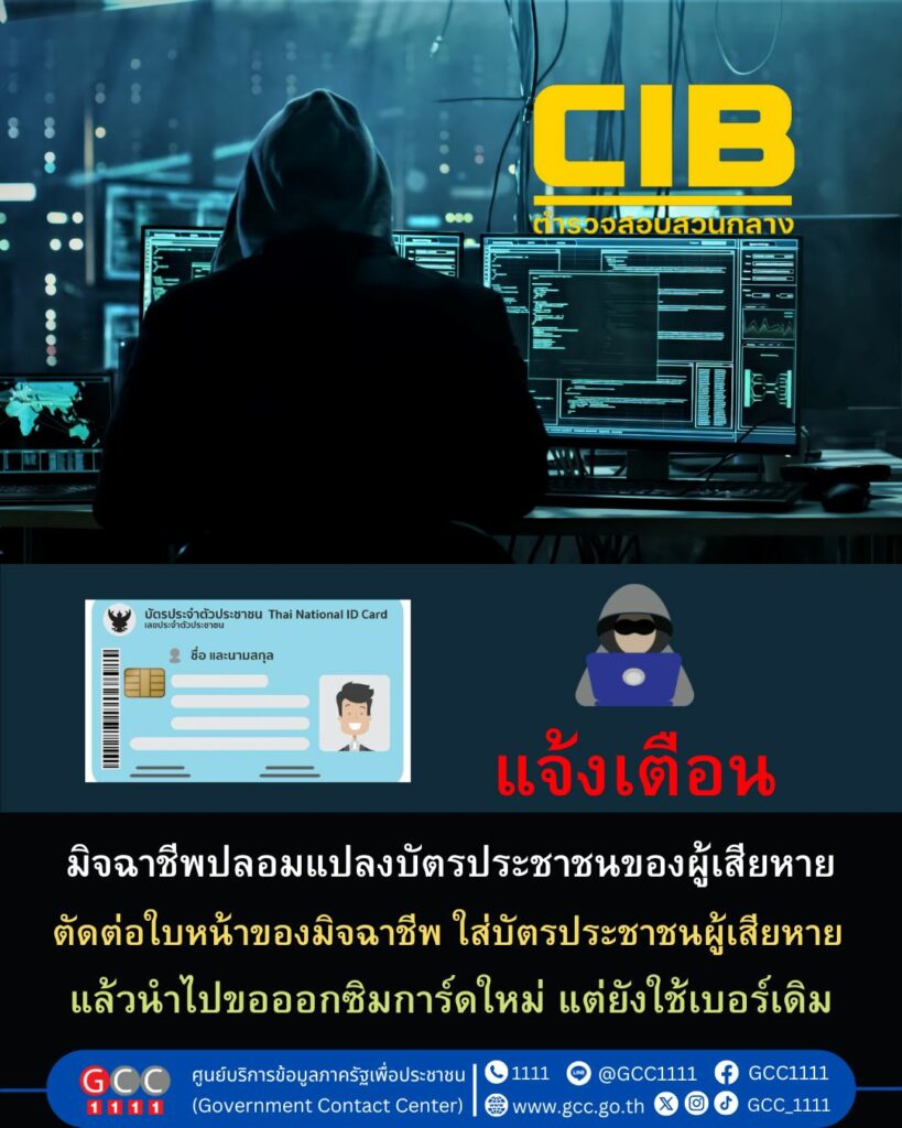 กองบัญชาการตำรวจสอบสวนกลาง แจ้งเตือนขณะนี้มีมิจฉาชีพปลอมแปลงบัตรประชาชนของผู้เสียหาย โดยตัดต่อใบหน้าของมิจฉาชีพไปใส่แทนภาพถ่ายบัตรประชาชนของผู้เสียหาย แล้วนำไปขอออกซิมการ์ดใหม่แต่ใช้เบอร์เดิม เมื่อมิจฉาชีพเข้าใช้งานหมายเลขโทรศัพท์ของผู้เสียหายได้แล้ว มิจฉาชีพก็จะเข้าสู่ระบบของบัตรเครดิตผู้เสียหาย เพื่อขอรหัส OTP ในการชำระเงินผ่านบัตรเครดิต ก่อนจะนำไปบัตรเครดิตของผู้เสียหายไปใช้จ่าย สร้างความเสียหายเป็นอย่างมาก ขอให้ระมัดระวังการเปิดเผยหรือส่งต่อข้อมูลส่วนบุคคล เช่น บัตรประชาชนผ่านโซเชียลมีเดียทุกแพลตฟอร์ม ให้หน่วยงานหรือบุคคลที่ไม่น่าเชื่อถือ ตรวจสอบความน่าเชื่อถือของหน่วยงานที่ขอข้อมูลส่วนบุคคลทุกครั้ง เพื่อความปลอดภัยและไม่ตกเป็นเหยื่อของมิจฉาชีพ