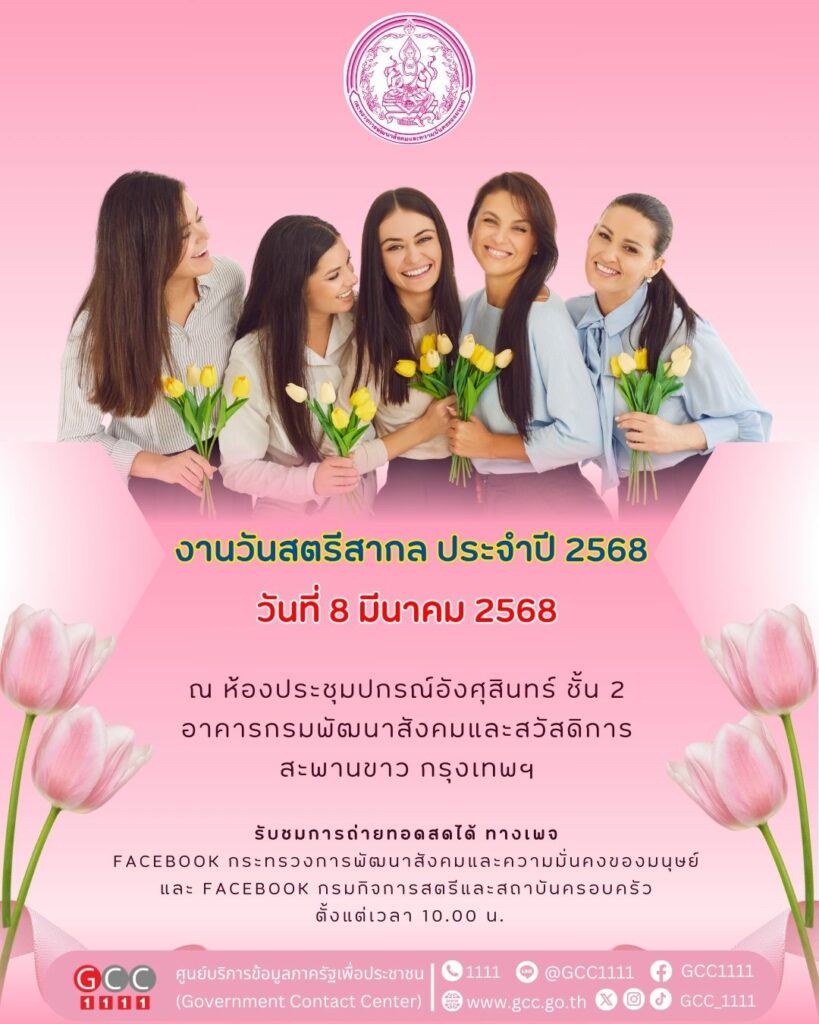 ในวันที่ 8 มีนาคมนี้ จึงขอเชิญชวนทุกท่านร่วมเป็นส่วนหนึ่งของการสนับสนุนพลังสตรีในการขับเคลื่อนการพัฒนาประเทศในทุกมิติ และสามารถรับชมการถ่ายทอดสดได้ทางเพจ Facebook กระทรวงการพัฒนาสังคมและความมั่นคงของมนุษย์ และ Facebook กรมกิจการสตรีและสถาบันครอบครัว ตั้งแต่เวลา 10.00 น.