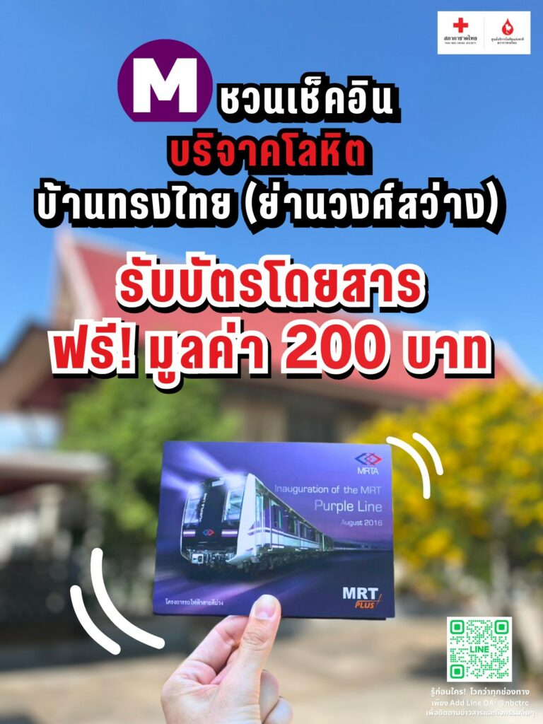 - การรถไฟฟ้าขนส่งมวลชนแห่งประเทศไทย เชิญชวนบริจาคโลหิต ในกิจกรรม “ปันโลหิตติดMRT” พร้อมรับบัตรโดยสาร ฟรีมูลค่า 200 บาท