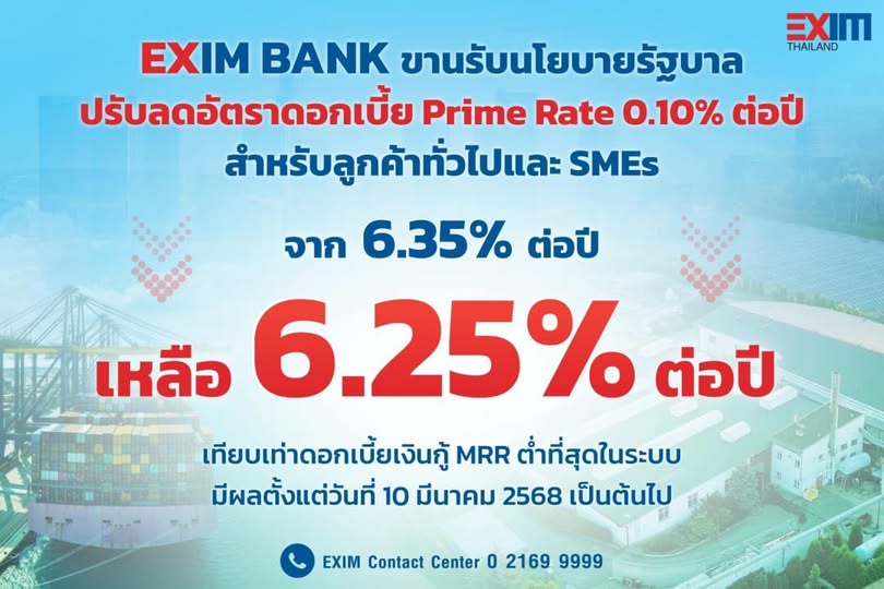 EXIM BANK ประกาศปรับลดอัตราดอกเบี้ย Prime Rate ลง 0.10% ต่อปี เหลือ 6.25% ต่อปี