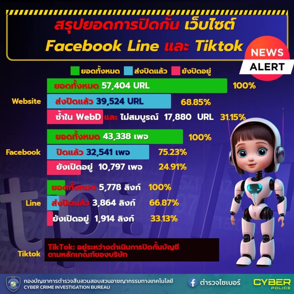ตำรวจไซเบอร์ เผยผลการประสานปิดกั้น Website Facebook Line ในห้วง 4 เดือนที่ผ่านมา (พ.ย.67 – ก.พ.68)