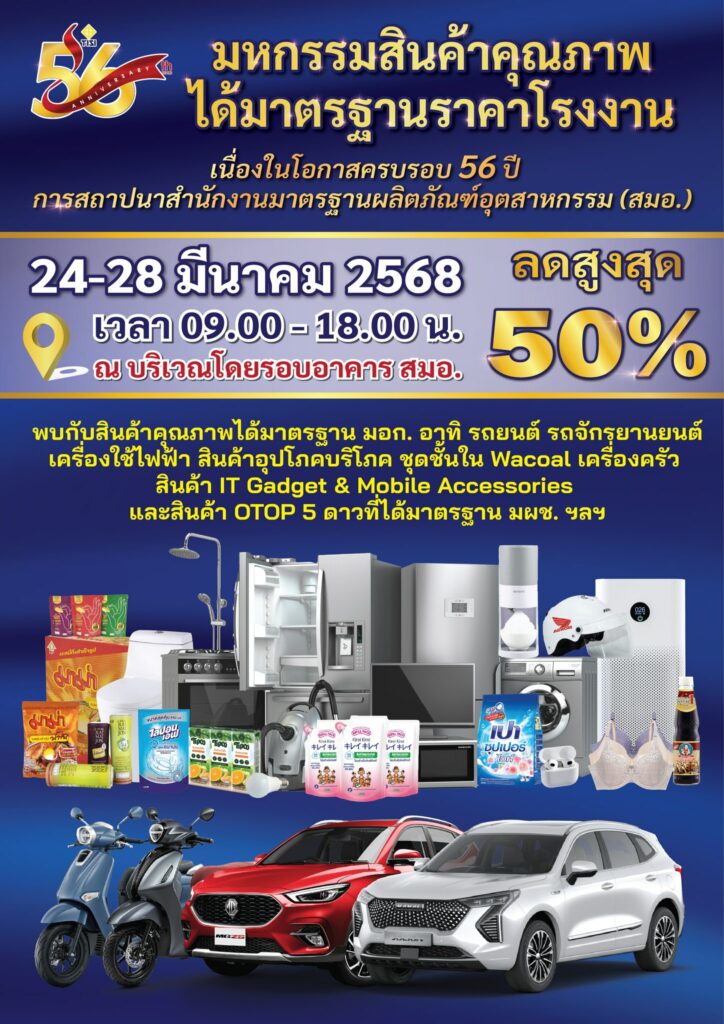 งานมหกรรมสินค้าคุณภาพได้มาตรฐานราคาโรงงาน เนื่องในโอกาสครบรอบ 56 ปี การสถาปนาสำนักงานมาตรฐานผลิตภัณฑ์อุตสาหกรรม วันที่ 24 – 28 มีนาคม 2568