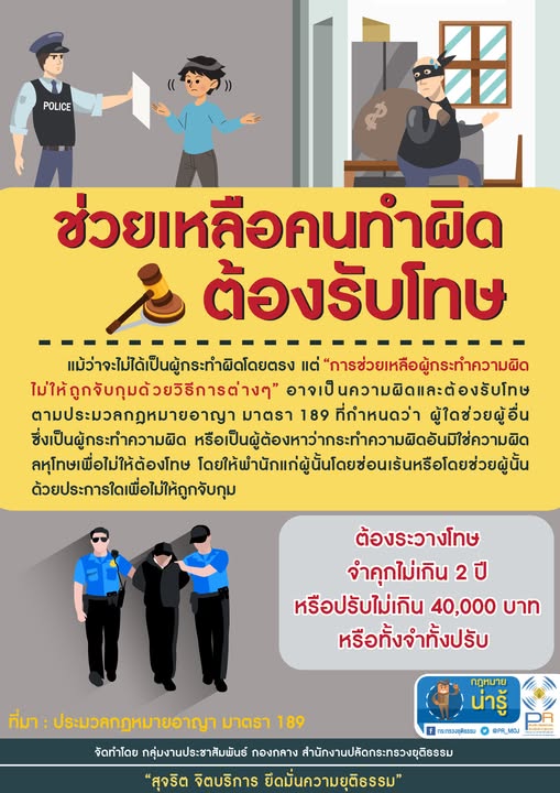กระทรวงยุติธรรม เตือน หากใครช่วยเหลือผู้กระทำความผิดหรือผู้ต้องหาที่หลบหนีไม่ให้ถูกจับกุม เช่น ซ่อนเร้นหรือให้ที่พักอาศัยเพื่อป้องกันการจับกุม ต้องระวางโทษจำคุกไม่เกิน 2 ปี หรือปรับไม่เกิน 40,000 บาท หรือทั้งจำทั้งปรับ