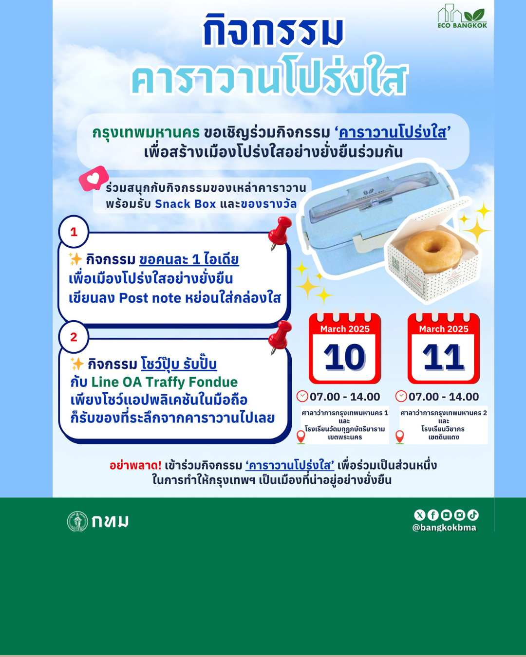 กรุงเทพมหานคร เชิญชวนร่วมกิจกรรม ‘คาราวานโปร่งใส’ เพื่อสร้างเมืองโปร่งใสอย่างยั่งยืนร่วมกัน และสร้างวินัยความโปร่งใสในตนเอง