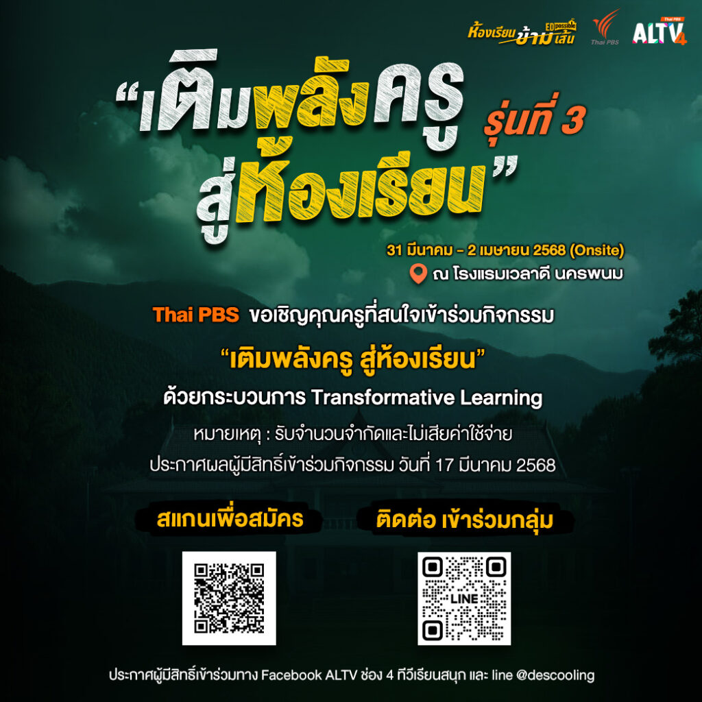 ประกาศผลผู้มีสิทธิ์เข้าร่วมกิจกรรม วันที่ 17 มีนาคม 2568 ทาง Facebook Fanpage ALTV ช่อง 4 ทีวีเรียนสนุก ก.ค.ศ. และ Line @deschooling เท่านั้น