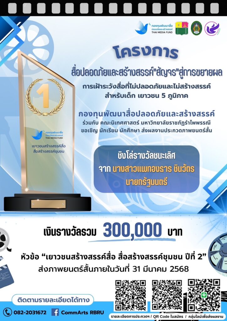 สำนักงานกองทุนพัฒนาสื่อปลอดภัยและสร้างสรรค์ เชิญชวนนักเรียนและนักศึกษา ส่งผลงาน “ภาพยนตร์สั้น” ในโครงการสื่อปลอดภัยและสร้างสรรค์ “สัญจร” สู่การขยายผลการเฝ้าระวังสื่อที่ไม่ปลอดภัยและไม่สร้างสรรค์ สำหรับเด็ก เยาวชน 5 ภูมิภาค ภายใต้หัวข้อ“เยาวชนสร้างสรรค์สื่อ สื่อสร้างสรรค์ชุมชน ปีที่ 2