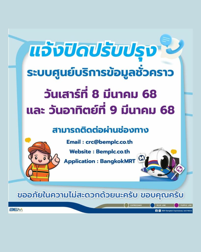 บริษัท ทางด่วนและรถไฟฟ้ากรุงเทพ จำกัด (มหาชน) แจ้งปิดปรับปรุงระบบบศูนย์บริการข้อมูล วันเสาร์ที่ 8 และ วันอาทิตย์ที่ 9 มีนาคม 2568