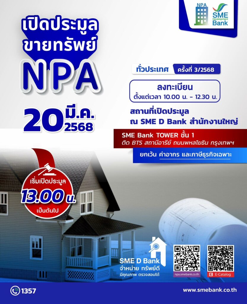 SME D Bank จัดงานประมูลขายทรัพย์NPA ทั่วประเทศ ครั้งที่3 (สำนักงานใหญ่) 20 มีนาคม 2568 ข่าวสารกิจกรรม SME D Bank จัดงานประมูลขายทรัพย์NPA ทั่วประเทศ ครั้งที่3 (สำนักงานใหญ่) 20 มีนาคม 2568 ธนาคารพัฒนาวิสาหกิจขนาดกลางและขนาดย่อมแห่งประเทศไทย จัดงานประมูลขายทรัพย์NPA ทั่วประเทศ ครั้งที่3 (สำนักงานใหญ่) ในวันพฤหัสบดีที่ 20 มีนาคม 2568 ลงทะเบียน ตั้งแต่เวลา 10.00 – 12.30 น. ณ SME Bank สำนักงานใหญ่ เริ่มเปิดประมูล เวลา 13.00 น. เป็นต้นไป ทั้งนี้ ยกเว้น ค่าอากร และภาษีธุรกิจเฉพาะ ที่มา : https://citly.me/3y4X1 Post Views: 17 FacebookFacebookXTwitterLINELine