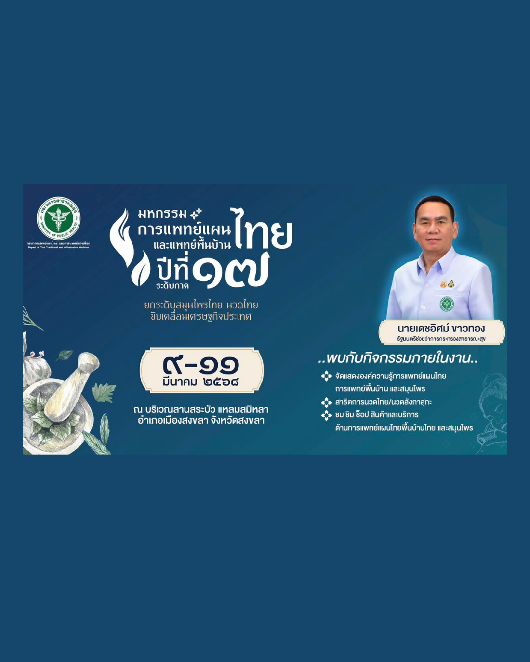 กรมการแพทย์แผนไทยและการแพทย์ทางเลือก เชิญร่วมงานมหกรรมการแพทย์แผนไทยและแพทย์พื้นบ้านไทย ปีที่ 17 ระดับภาค ยกระดับสมุนไพรไทย นวดไทย ขับเคลื่อนเศรษฐกิจประเทศ ตั้งแต่บัดนี้ – 11 มีนาคม 2568 ณ บริเวณลานสระบัว แหลมสมิหลา อำเภอเมืองสงขลา จังหวัดสงขลา