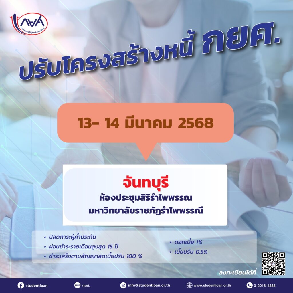 กองทุนเงินให้กู้ยืมเพื่อการศึกษา ขอเชิญผู้กู้ยืมเข้าร่วมงานปรับโครงสร้างหนี้ วันที่ 13 – 14 มี.ค. 68