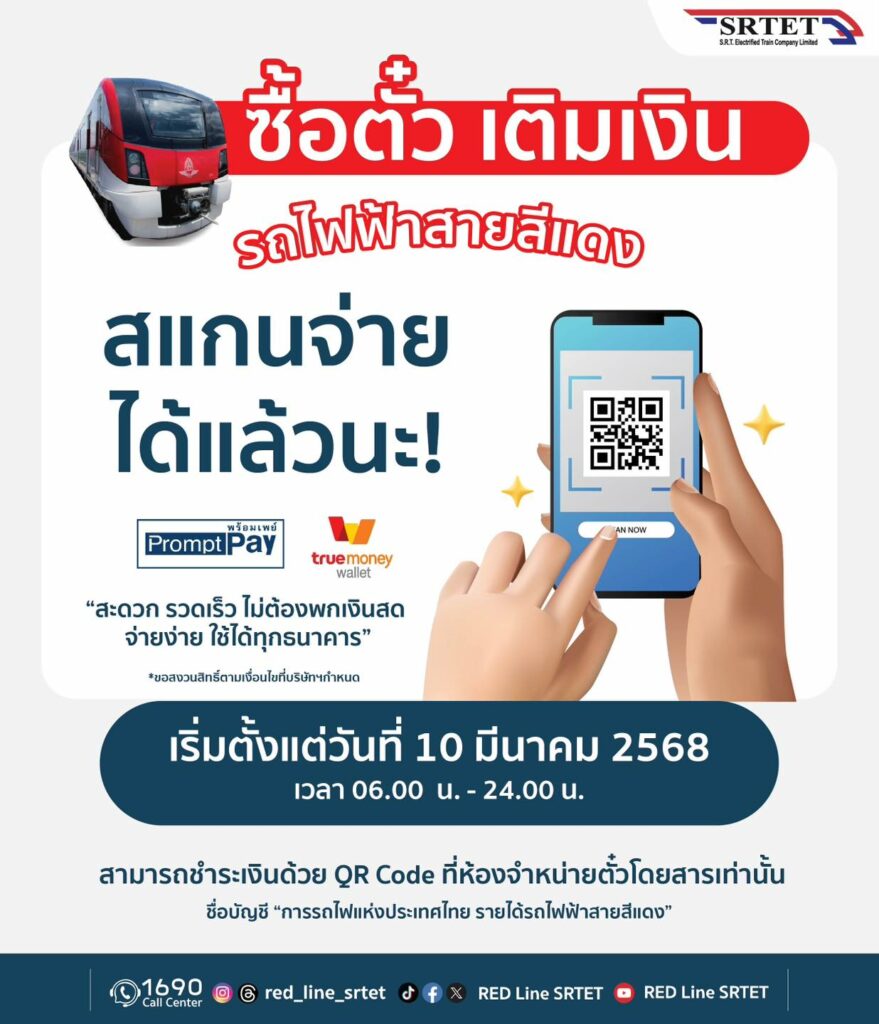 รถไฟฟ้าสายสีแดง เปิดให้บริการชำระค่าโดยสารและเติมเงินบัตรโดยสารรถไฟฟ้าสายสีแดงผ่าน QR Code เพื่อเพิ่มความสะดวกและลดการใช้เงินสด รองรับการชำระเงินจากทุกธนาคาร เริ่มให้บริการตั้งแต่วันที่ 10 มีนาคม 2568 เวลา 06.00 – 24.00 น. สามารถชำระเงินผ่าน QR Code ได้ที่ ห้องจำหน่ายตั๋วโดยสาร ชื่อบัญชี “การรถไฟแห่งประเทศไทย รายได้รถไฟฟ้าสายสีแดง”