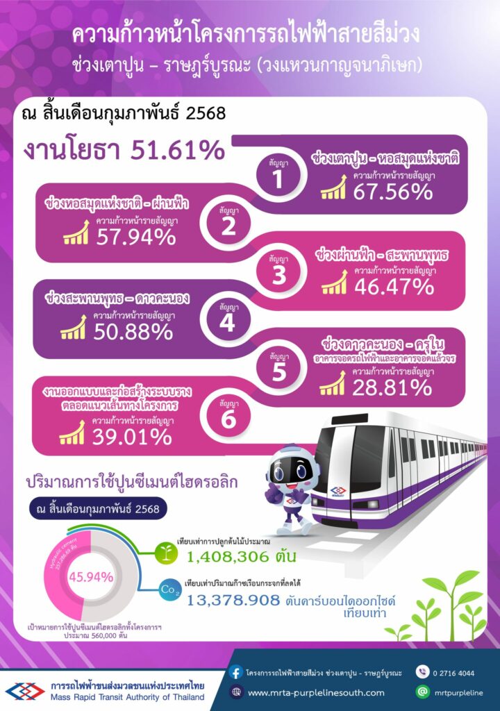 การรถไฟฟ้าขนส่งมวลชนแห่งประเทศไทย รายงานความคืบหน้างานก่อสร้างโครงการรถไฟฟ้าสายสีม่วง ช่วงเตาปูน – ราษฎร์บูรณะ (วงแหวนกาญจนาภิเษก) เดือนกุมภาพันธ์ 2568
