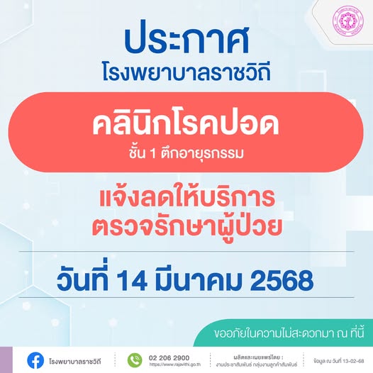 โรงพยาบาลราชวิถี กรมการแพทย์ แจ้ง “คลินิกโรคปอด” ลดให้บริการตรวจรักษาผู้ป่วย วันศุกร์ที่ 14 มีนาคม 2568