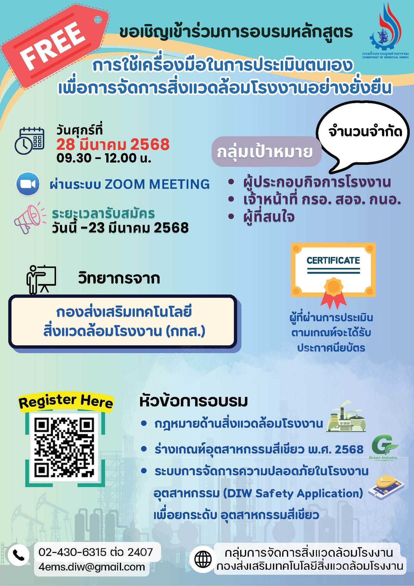 กรมโรงงานอุตสาหกรรม จัดโครงการการใช้เครื่องมือในการประเมินตนเองเพื่อการจัดการสิ่งแวดล้อมโรงงานอย่างยั่งยืน วันที่ 28 มีนาคม 2568 เวลา 09.30 – 12.00 น. ผ่านระบบออนไลน์ โปรแกรม Zoom Meeting (รับจำนวนจำกัด 500 ราย) ผู้ที่สนใจสามารถลงทะเบียนตั้งแต่บัดนี้ – 23 มีนาคม 2568โดยไม่มีค่าใช้จ่ายได้ที่ https://forms.gle/5Kptu4Y4FTURumk46 ทั้งนี้ ผู้ที่ผ่านการทดสอบหลังการอบรม จะได้รับประกาศนียบัตรรับรอง