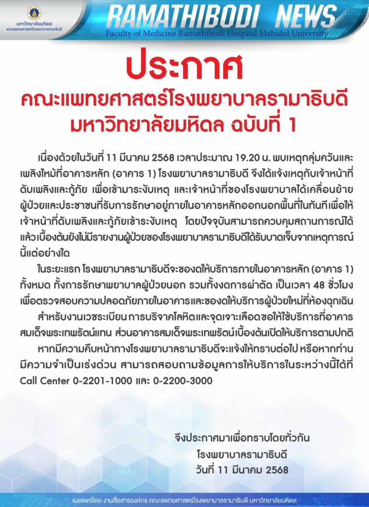 คณะแพทยศาสตร์โรงพยาบาลรามาธิบดี แจ้งงดบริการภายในอาคารหลัก 48 ชม.หลังเกิดเพลิงไหม้ เนื่องด้วยในวันที่ 11 มีนาคม 2568 เวลาประมาณ 19.20 น. พบเหตุกลุ่มควันและ เพลิงไหม้ที่อาคารหลัก (อาคาร 1) โรงพยาบาลรามาธิบดี จึงได้แจ้งเหตุกับเจ้าหน้าที่ดับเพลิงและกู้ภัย เพื่อเข้ามาระงับเหตุ และเจ้าหน้าที่ของโรงพยาบาลได้เคลื่อนย้ายผู้ป่วยและประชาชนที่รับการรักษาอยู่ภายในอาคารหลักออกนอกพื้นที่ในทันทีเพื่อให้เจ้าหน้าที่ดับเพลิงและกู้ภัยเข้าระงับเหตุ ปัจจุบันสามารถควบคุมสถานการณ์ได้แล้ว เบื้องต้นยังไม่มีรายงานผู้ป่วยของโรงพยาบาลฯ ได้รับบาดเจ็บจากเหตุการณ์นี้แต่อย่างใด ในระยะแรก ของดให้บริการภายในอาคารหลัก (อาคาร 1) ทั้งหมด ทั้งการรักษาพยาบาลผู้ป่วยนอก รวมทั้งงดการผ่าตัด เป็นเวลา 48 ชั่วโมง สำหรับงานเวชระเบียน การบริจาคโลหิตและจุดเจาะเลือดขอให้ใช้บริการที่อาคารสมเด็จพระเทพรัตน์แทน ส่วนอาคารสมเด็จพระเทพรัตน์เบื้องต้นเปิดให้บริการตามปกติ