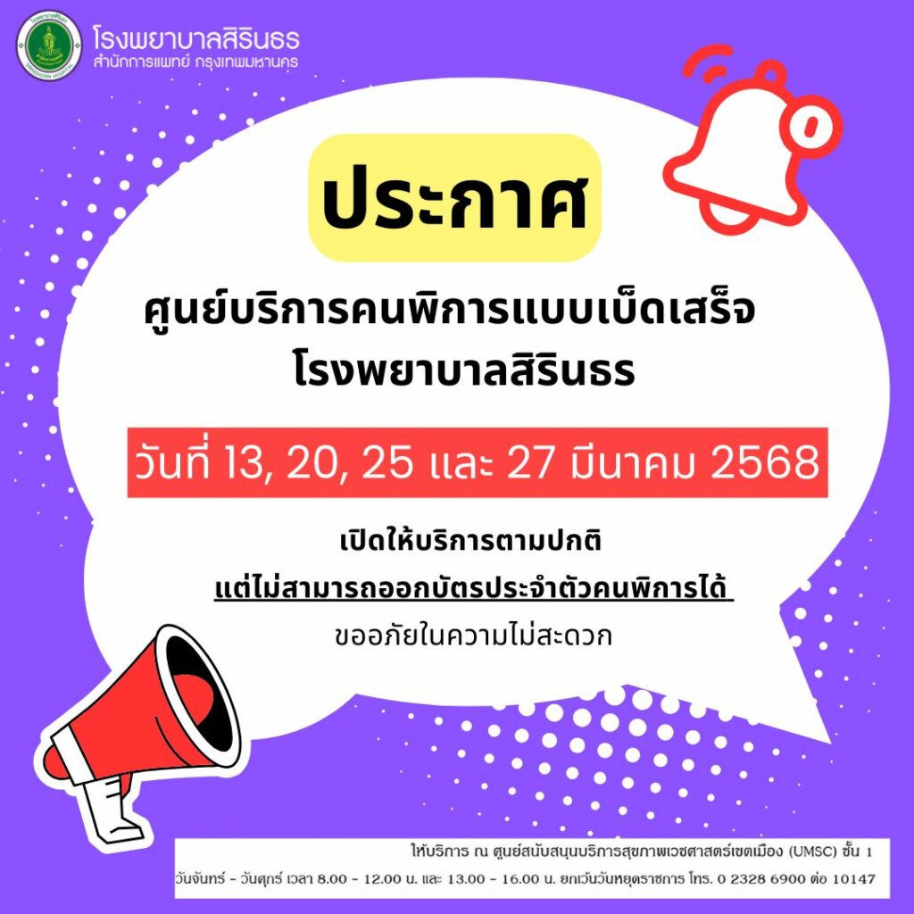 ศูนย์บริการคนพิการแบบเบ็ดเสร็จ กรุงเทพมหานคร โรงพยาบาลสิรินธร เปิดให้บริการปกติ วันที่ 13, 20, 25 และ 27 มีนาคม 2568 แต่ไม่สามารถออกบัตรประจำตัวคนพิการภายในวันเดียวได้ เนื่องจากเจ้าหน้าที่ติดภารกิจ