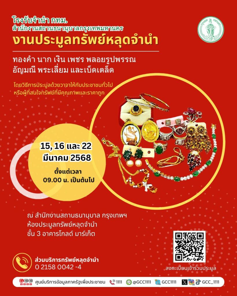 สำนักงานสถานธนานุบาลกรุงเทพมหานคร เปิดประมูลทรัพย์หลุดจำนำ เดือนมีนาคม 2568