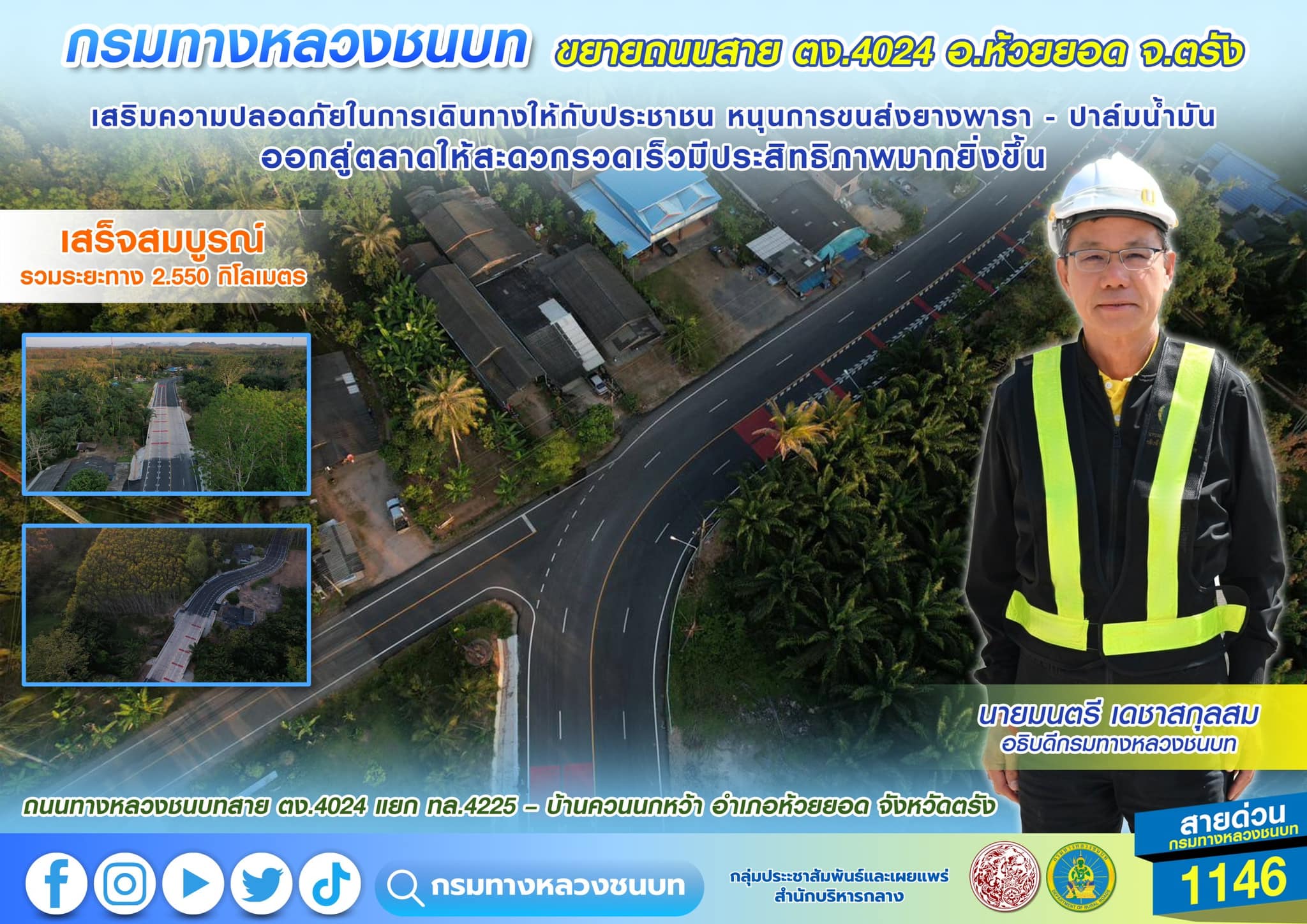 กรมทางหลวงชนบท ขยายถนนสาย ตง.4024 อ.ห้วยยอด จ.ตรัง เสร็จสมบูรณ์ เสริมความปลอดภัยในการเดินทางให้กับประชาชน หนุนการขนส่งยางพารา – ปาล์มน้ำมัน ออกสู่ตลาดให้สะดวกรวดเร็วมีประสิทธิภาพมากยิ่งขึ้น