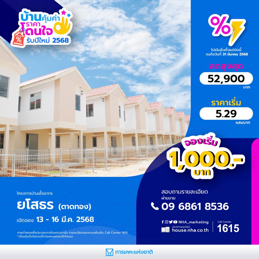 การเคหะแห่งชาติ เปิดจองโครงการบ้านเอื้ออาทรยโสธร (ตาดทอง) ระหว่างวันที่ 13 – 16 มีนาคม 2568