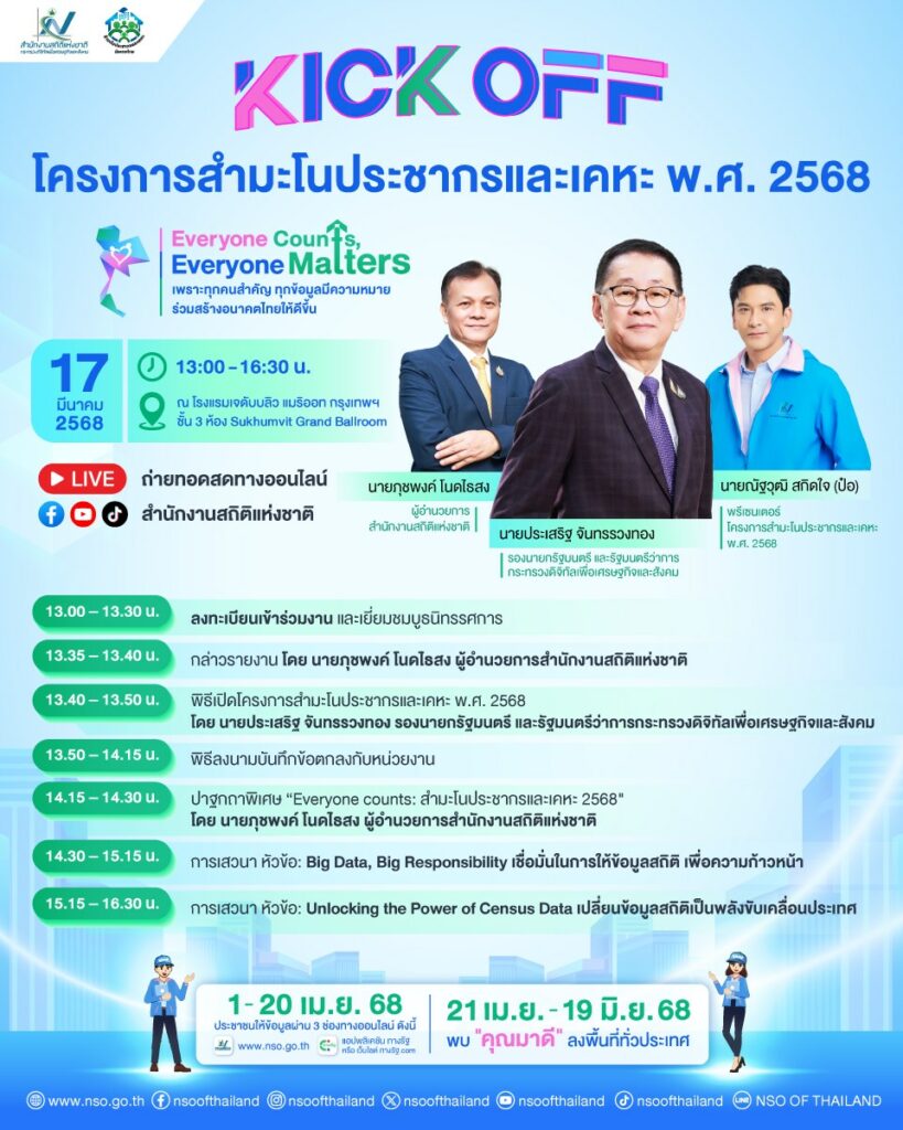 สำนักงานสถิติแห่งชาติ ขอเชิญชวนร่วมงาน “เปิดตัวโครงการสำมะโนประชากรและเคหะ พ.ศ. 2568” การเก็บข้อมูลประชากรแบบ Digital Census อย่างเต็มรูปแบบครั้งแรกของประเทศไทย