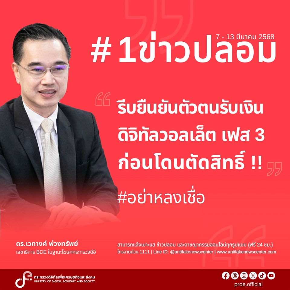 กระทรวงดิจิทัลเพื่อเศรษฐกิจและสังคม (ดีอี) เตือน “มิจฉาชีพ” ปล่อยข่าวปลอม “รีบยืนยันตัวตนรับเงินดิจิทัลวอลเล็ตเฟส 3 ก่อนโดนตัดสิทธิ์” เสี่ยงสูญข้อมูลส่วนบุคคล- ทรัพย์สิน