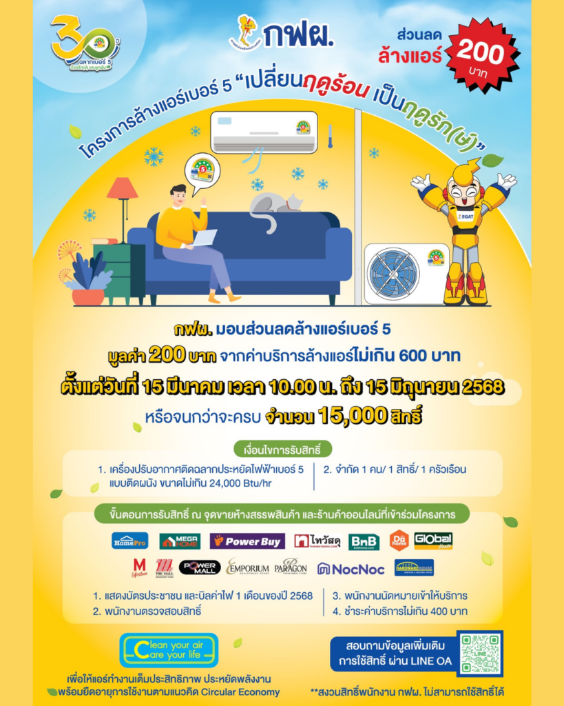 กฟผ. มอบส่วนลดค่าล้างเครื่องปรับอากาศ 200 บาท จำนวน 15,000 สิทธิ์ เริ่ม 15 มี.ค. – 15 มิ.ย. 68