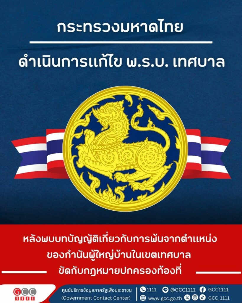 กระทรวงมหาดไทย แก้ไข พ.ร.บ. เทศบาล แก้ปัญหาตำแหน่งกำนัน-ผู้ใหญ่บ้านขัดกฎหมายปกครองท้องที่