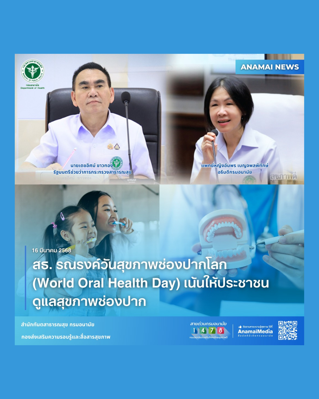นายเดชอิศม์ ขาวทอง รัฐมนตรีช่วยว่าการกระทรวงสาธารณสุข เปิดเผยว่า วันสุขภาพช่องปากโลก (World Oral Health Day) ตรงกับวันที่ 20 มีนาคม ของทุกปี ในปีนี้ กระทรวงสาธารณสุข โดย กรมอนามัย เตรียมจัดงานวันสุขภาพช่องปากโลก (World Oral Health Day) วันที่ 17 มีนาคม 2568 ณ โรงแรมทีเค พาเลซ แจ้งวัฒนะ กรุงเทพมหานคร เพื่อรณรงค์สร้างกระแสให้ประชาชนเห็นความสำคัญในการดูแลสุขภาพช่องปาก เพราะจากการสำรวจปัญหาสุขภาพช่องปากคนไทยยังพบปัญหา 3 ด้าน คือ 1) ฟันผุ ยังคงเป็นปัญหาหลักในคนไทย โดยเฉพาะในเด็กและวัยรุ่น ซึ่งส่วนใหญ่เกิดจากการไม่รักษาความสะอาดช่องปาก การรับประทานอาหารหวานบ่อยๆ และการไม่ไปพบทันตแพทย์เพื่อตรวจเช็คฟัน 2) โรคเหงือกอักเสบ เป็นปัญหาที่พบได้มากในผู้ใหญ่ โดยโรคนี้มักเกิดจากการสะสมของคราบพลัคที่ไม่ถูกขจัดออก ทำให้เกิดการอักเสบและการติดเชื้อในเหงือก 3) การขาดการตรวจสุขภาพช่องปาก คนไทยจำนวนไม่น้อยยังไม่ให้ความสำคัญกับการตรวจสุขภาพช่องปากเป็นประจำ ซึ่งอาจทำให้ปัญหาที่เกิดขึ้นไม่ถูกตรวจพบและรักษาในระยะเริ่มต้น