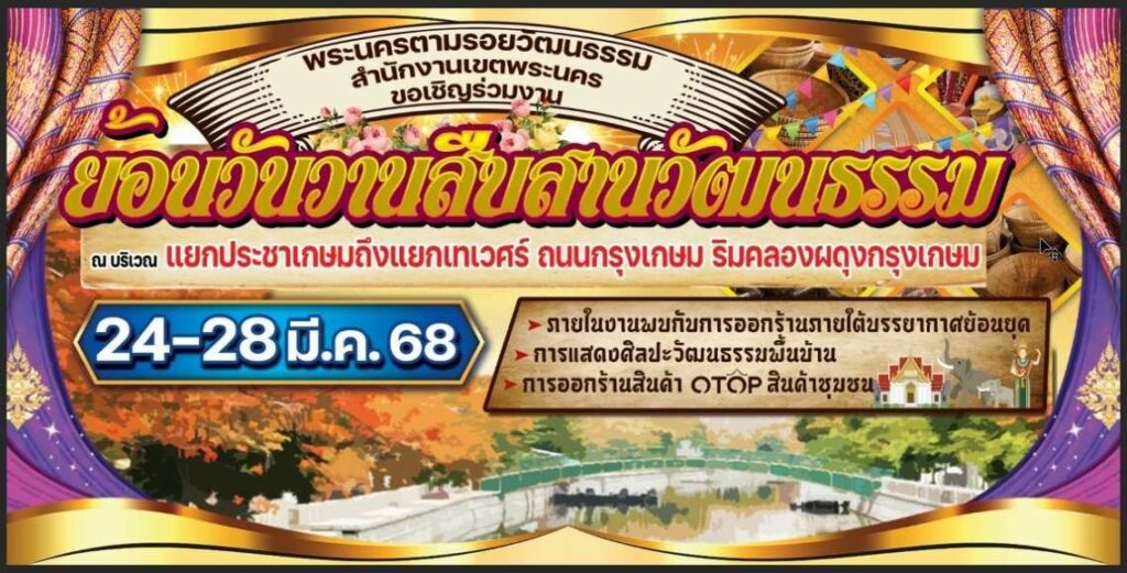 สำนักงานเขตพระนคร ขอเชิญร่วมงานย้อนวันวานสืบสานวัฒนธรรม วันที่ 24 – 28 มีนาคม 2568 เวลา 16.00 – 22.00 น. บริเวณแยกประชาเกษม ถนนกรุงเกษม ริมคลองผดุงกรุงเกษม เขตพระนคร กรุงเทพมหานคร