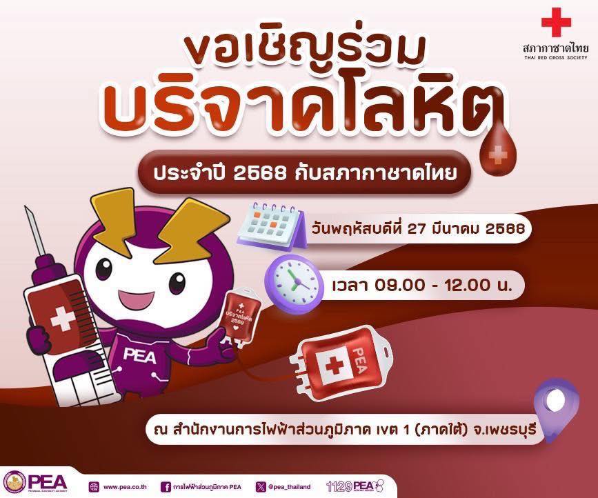 PEA ขอเชิญร่วมบริจาคโลหิต ประจำปี 2568 กับสภากาชาดไทย วันที่ 27 มี.ค. 68