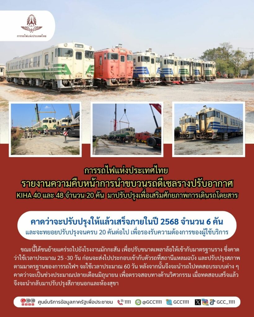 การรถไฟแห่งประเทศไทย รายงานความคืบหน้าการนำขบวนรถดีเซลรางปรับอากาศ KIHA 40 และ 48 จำนวน 20 คัน โดยนำมาปรับปรุงเพื่อเสริมศักยภาพการเดินรถโดยสาร ซึ่งขณะนี้ได้ขนย้ายแคร่รถไปยังโรงงานมักกะสัน เพื่อปรับขนาดเพลาล้อให้เข้ากับมาตรฐานราง คาดว่าใช้เวลาประมาณ 25 -30 วัน ก่อนจะส่งไปประกอบเข้ากับตัวรถที่สถานีแหลมฉบัง และปรับปรุงสภาพตามมาตรฐานของการรถไฟฯ ซึ่งกระบวนการเหล่านี้จะใช้เวลาประมาณ 60 วันหลังจากนั้นจึงจะนำรถไปทดสอบระบบต่าง ๆ คาดว่าจะเป็นช่วงประมาณปลายเดือนมิถุนายน เพื่อตรวจสอบทางด้านวิศวกรรม เมื่อทดสอบเสร็จแล้วจึงจะนำกลับมาปรับปรุงสีภายนอกและห้องสุขา ทั้งนี้ คาดว่าจะสามารถดำเนินการปรับปรุงให้แล้วเสร็จได้ภายในปี 2568 จำนวน 6 คัน และจะทยอยปรับปรุงจนครบ 20 คันต่อไป เพื่อรองรับความต้องการของผู้ใช้บริการ