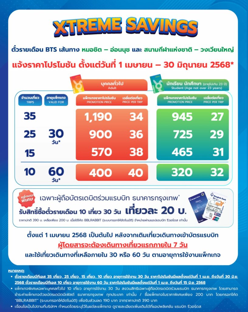 รถไฟฟ้าบีทีเอส แจ้งราคาโปรโมชันใหม่ ‘XTREME SAVINGS’ มีผลตั้งแต่วันที่ 1 เม.ย. – 30 มิ.ย. 68