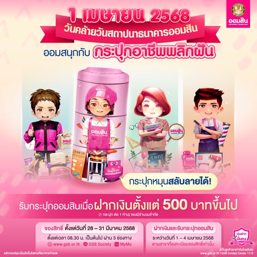 ธนาคารออมสิน ฉลองวันคล้ายวันสถาปนาธนาคารออมสิน 1 เมษายน 2568 รับกระปุก “อาชีพพลิกฝัน” ออมเงินให้สนุกกับกระปุกหมุนลายเปลี่ยนอาชีพ เมื่อฝากเงินตั้งแต่ 500 บาทขึ้นไป  รับกระปุก “อาชีพพลิกฝัน” (1 กระปุก/ท่าน) ของมีจำนวนจำกัด
