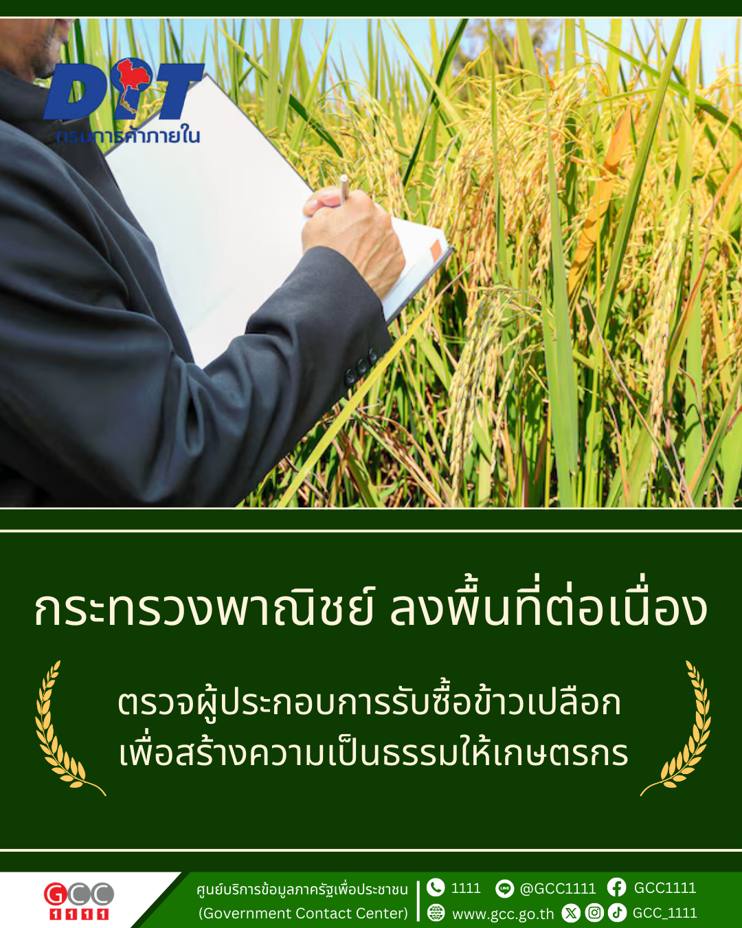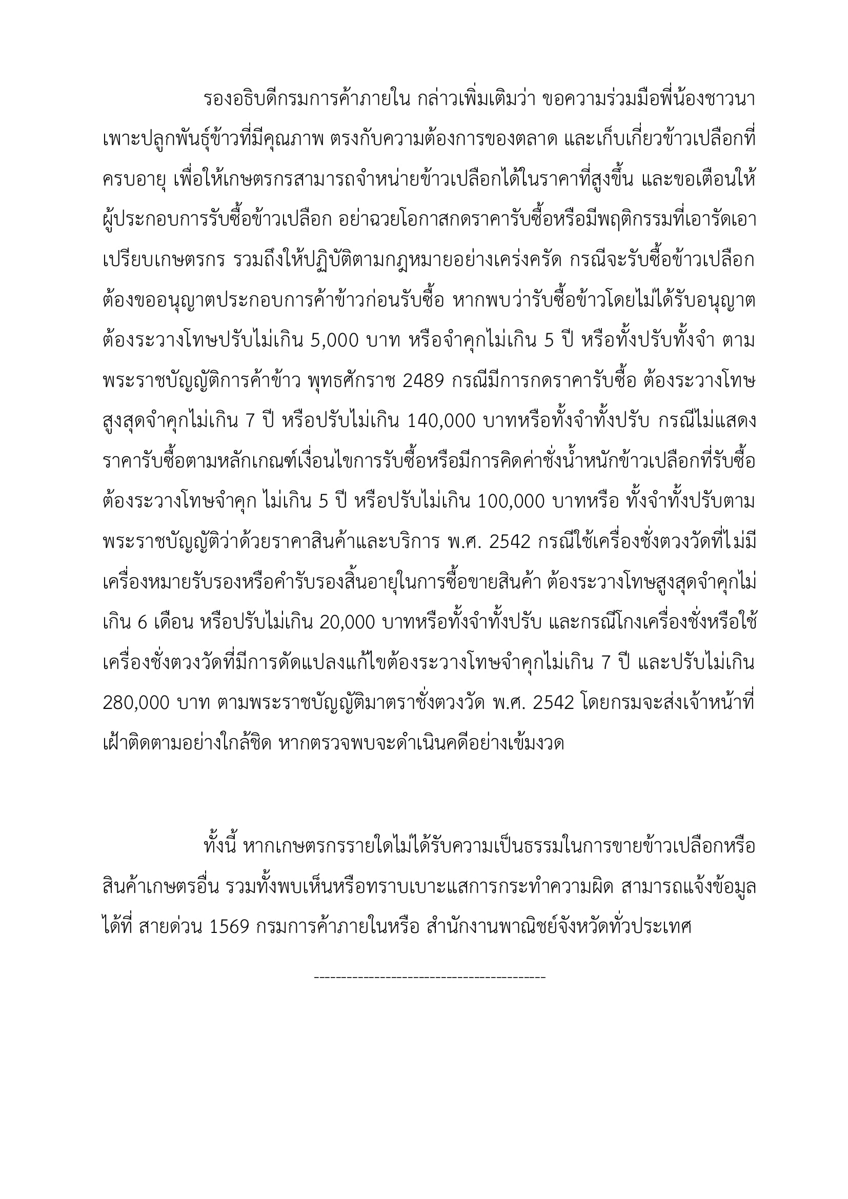 ทั้งนี้ หากเกษตรกรรายใดไม่ได้รับความเป็นธรรมในการขายข้าวเปลือกหรือ สินค้าเกษตรอื่น รวมทั้งพบเห็นหรือทราบเบาะแสการกระทําความผิด สามารถแจ้งข้อมูล ได้ที่ สายด่วน 1569 กรมการค้าภายในหรือ สํานักงานพาณิชย์จังหวัดทั่วประเทศ