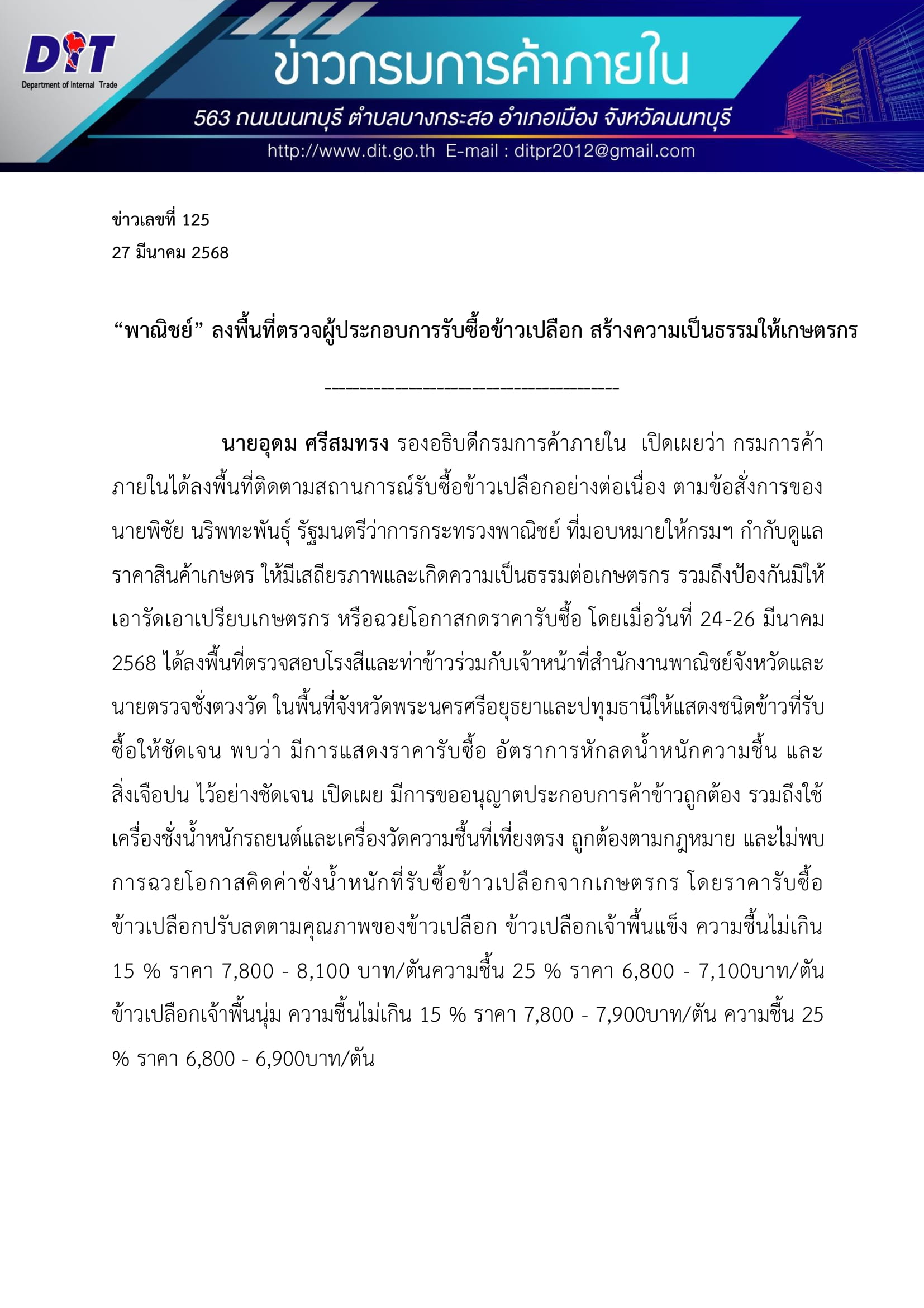 นายอุดม ศรีสมทรง รองอธิบดีกรมการค้าภายใน เปิดเผยว่า กรมการค้า ภายในได้ลงพื้นที่ติดตามสถานการณ์รับซื้อข้าวเปลือกอย่างต่อเนื่อง ตามข้อสั่งการของ นายพิชัย นริพทะพันธุ์ รัฐมนตรีว่าการกระทรวงพาณิชย์ ที่มอบหมายให้กรมฯ กํากับดูแล ราคาสินค้าเกษตร ให้มีเสถียรภาพและเกิดความเป็นธรรมต่อเกษตรกร รวมถึงป้องกันมิให้ เอารัดเอาเปรียบเกษตรกร หรือฉวยโอกาสกดราคารับซื้อ โดยเมื่อวันที่ 24-26 มีนาคม 2568 ได้ลงพื้นที่ตรวจสอบโรงสีและท่าข้าวร่วมกับเจ้าหน้าที่สํานักงานพาณิชย์จังหวัดและ นายตรวจชั่งตวงวัด ในพื้นที่จังหวัดพระนครศรีอยุธยาและปทุมธานีให้แสดงชนิดข้าวที่รับ ซื้อให้ชัดเจน พบว่า มีการแสดงราคารับซื้อ อัตราการหักลดน้ำหนักความชื้น และ สิ่งเจือปน ไว้อย่างชัดเจน เปิดเผย มีการขออนุญาตประกอบการค้าข้าวถูกต้อง รวมถึงใช้ เครื่องชั่งน้ําหนักรถยนต์และเครื่องวัดความชื้นที่เที่ยงตรง ถูกต้องตามกฎหมาย และไม่พบ การฉวยโอกาสคิดค่าชั่งน้ําหนักที่รับซื้อข้าวเปลือกจากเกษตรกร โดยราคารับซื้อ ข้าวเปลือกปรับลดตามคุณภาพของข้าวเปลือก ข้าวเปลือกเจ้าพื้นแข็ง ความชื้นไม่เกิน 15 % ราคา 7,800 – 8,100 บาท/ตันความชื้น 25 % ราคา 6,800 – 7,100บาท/ตัน ข้าวเปลือกเจ้าพื้นนุ่ม ความชื้นไม่เกิน 15 % ราคา 7,800 – 7,900บาท/ตัน ความชื้น 25 % ราคา 6,800 – 6,900บาท/ตัน
