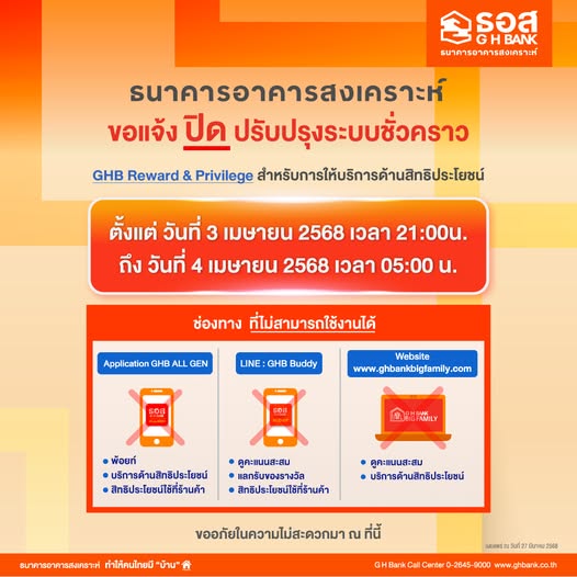 ธอส. ขอแจ้งปิดปรับปรุงระบบบริการ GHB Reward & Privilege วันที่ 3 – 4 เมษายน 2568 ข่าวสารกิจกรรม ธอส. ขอแจ้งปิดปรับปรุงระบบบริการ GHB Reward & Privilege วันที่ 3 – 4 เมษายน 2568 ธนาคารอาคารสงเคราะห์ ขอแจ้งปิดปรับปรุงระบบบริการ GHB Reward & Privilege สำหรับการให้บริการด้านสิทธิประโยชน์ ในช่องทางแอปพลิเคชัน GHB ALL GEN , LINE GHB BUDDY และ เว็บไซต์ ghbankbigfamily ตั้งแต่วันที่ 3 เมษายน 2568 เวลา 21.00 น. ถึง วันที่ 4 เมษายน 2568 เวลา 05.00 น.ขออภัยในความไม่สะดวกมา ณ ที่นี้ ทั้งนี้ เงื่อนไขเป็นไปตามที่ธนาคารกำหนด ที่มา : https://citly.me/HKPAt Post Views: 2 FacebookFacebookXTwitterLINELine