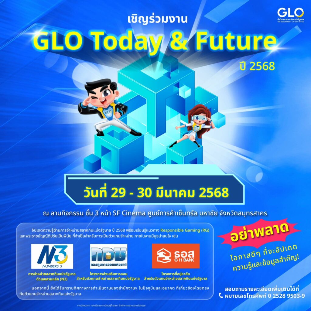 สำนักงานสลากกินแบ่งรัฐบาล ขอเชิญร่วมงาน GLO Today&Future วันที่ 29 – 30 มีนาคม 2568